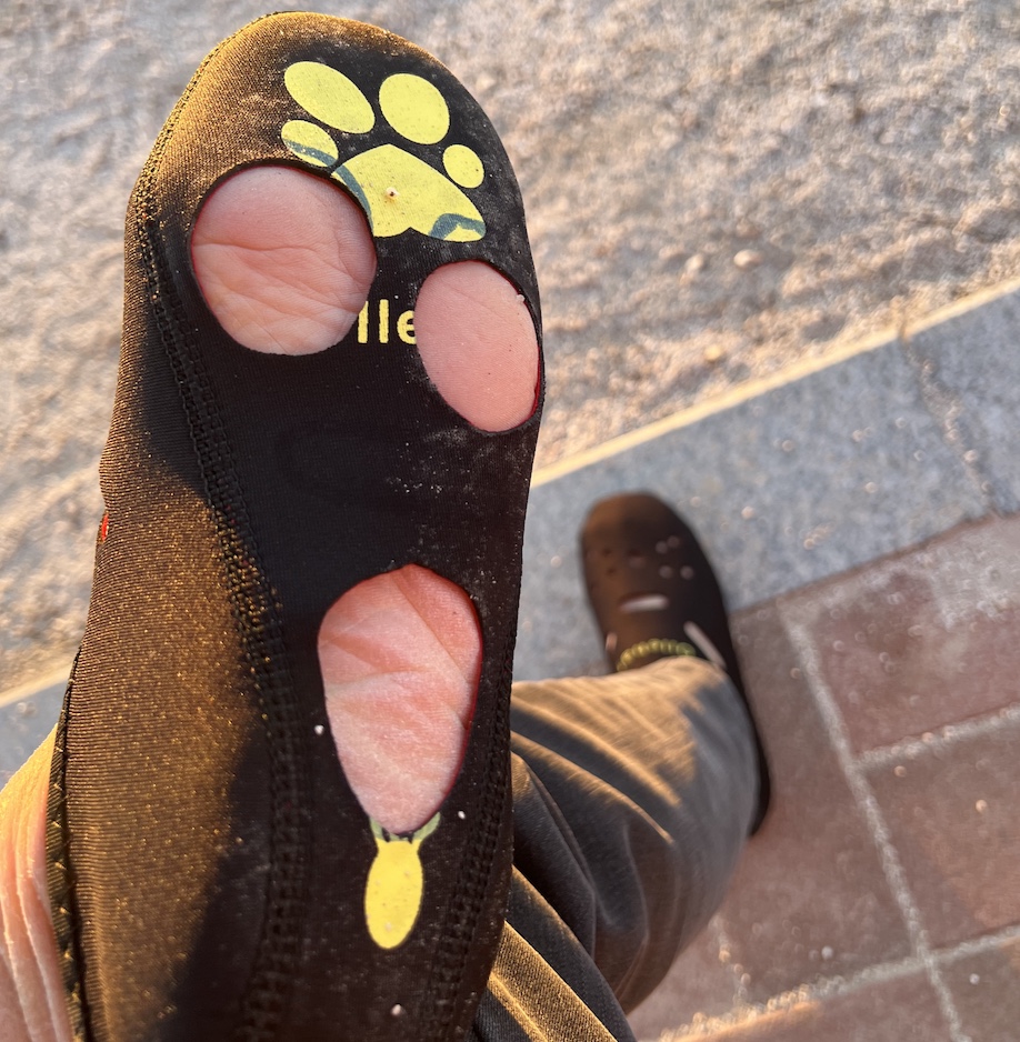 걷고 난 다음 발바닥을 보니, 언 땅에서 걸었더니 흙이 덜 묻습니다. 구멍은 잘 뚫은 거 같고, 새끼발가락도 그 자리에 잘 있습니다.