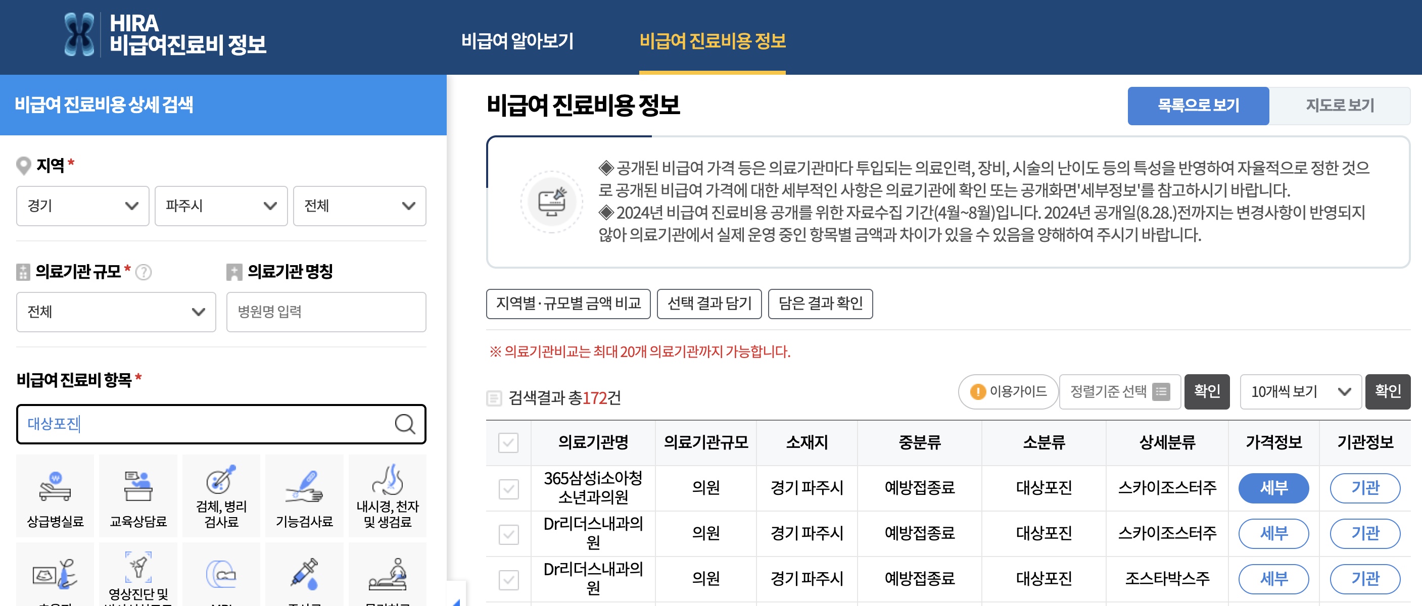 좌측 상단에 거주하는 지역을 '경기도'로 선택하고 비급여진료비항목 란에 "대상포진"을 기입 후 검색, 예방접종료를 '대상포진'으로 선택, 상세검색한 다음 우측의 병의원 정보에서 가격정보 '세부' 버튼을 눌러 조회하면 됩니다.