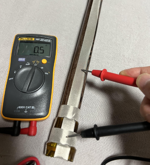 완성되었습니다. 테이프의 저항을 측정해 봤습니다. 전도성 테이프 기능이 제대로 되는지 확인해 보았습니다. 0.5 오옴이 나옵니다.