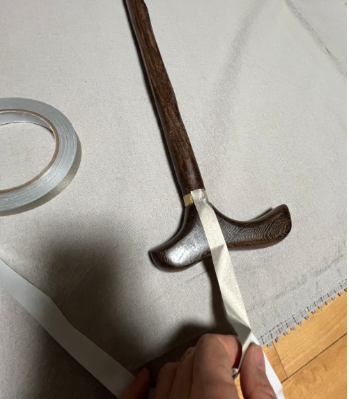 2). 반대쪽으로 넘겨서 지팡이 아래쪽으로 부착해 내려갑니다. 바닥까지 감싸서 부착합니다.