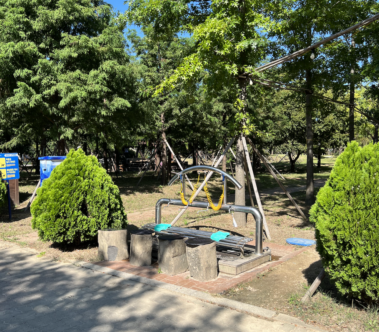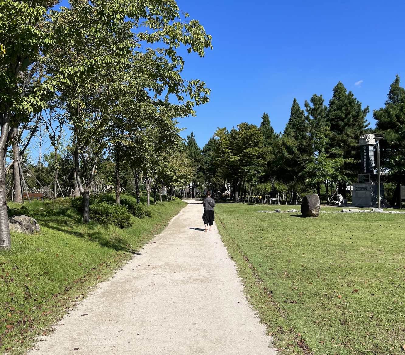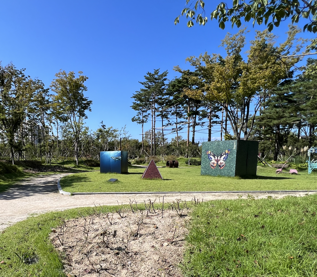 조성된 숲길을 따라서 운동장 트랙모양으로 나있는 산책로는 너비 약 3미터 정도로 4명이 충분히 교행이 가능할 정도로 비좁은 편은 아닙니다. 한 바퀴 거리는 대략 500미터로 보통의 걸음 속도라면 대략 5분여 가량 소요됩니다. 걷기 코스로는 아주 짧은 수준입니다만, 잘 가꾸어진 나무들과 조형물등을 보면서 산책할 수 있어서 지루하지 않습니다.