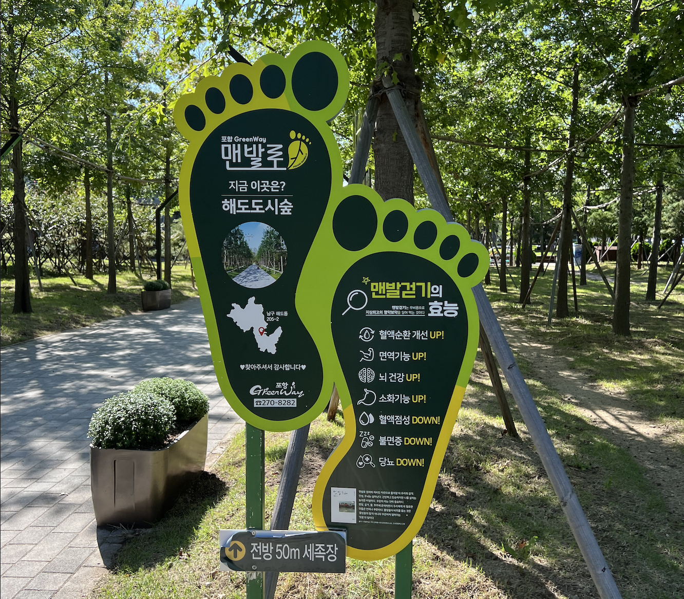 해도 도시숲길은 맨발걷기 트랙을 고려하여 만들어진 숲길입니다. 포항 문화예술회관 옆 공간을 조성한 공원으로 걷기 트랙의 길이는 큰 운동장 한 바퀴보다 조금 더 긴 구간으로 도심을 벗어난 한편에 자리 잡고 있습니다. 공원이 인접한 대형 주차장이 있어서, 주차 스트레스도 없고, 편리한 세족장과 화장실이 구비되어 있습니다.