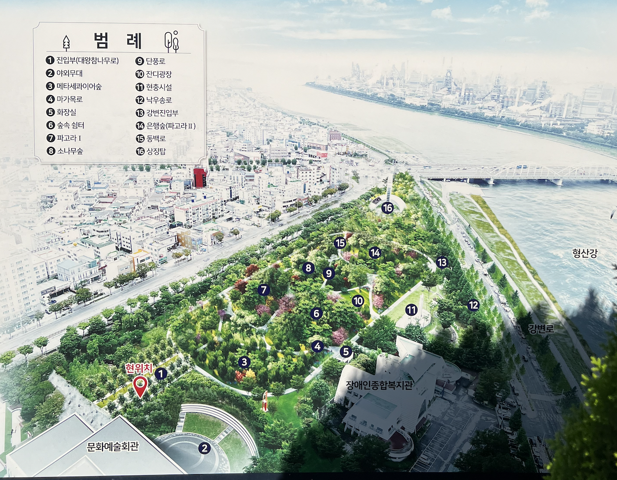 해도 도시숲길은 포항 시민운동장과 문화예술회관에 인접한 곳에 자리잡고 있습니다. 형산강을 바로 옆에 두고 있어서 강변 산책도 같이 생각해 볼 수 있습니다. 앞서 언급하였듯 여유 있는 문화예술회관 주차장을 이용하면 됩니다. 이동은 아무래도 자가 차량을 이용하는 것이 편리합니다. 걷기 트랙의 중간쯤에 공중화장실이 위치하고 있습니다. 따로 입장료를 받지 않고 개방시간 통제도 없습니다. 언제든 이용이 가능합니다.