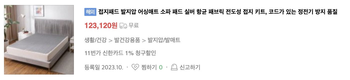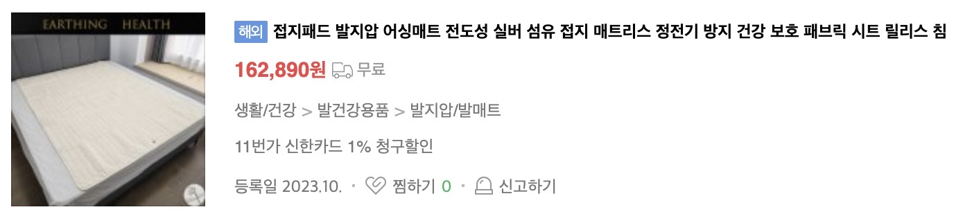 쇼핑몰에 접지매트 상품이 많이 나와 있습니다. 아래 링크에서 참고하시는데, 주의하실 점은 지압매트 같은 제품은 접지용 매트가 아닙니다. 매트는 모두 접지선이 포함된 제품이어야 합니다. 가격대는 작은 사이즈는 3만 원대에서 중간 사이즈는 5만 원대 7만 원대가 있습니다.