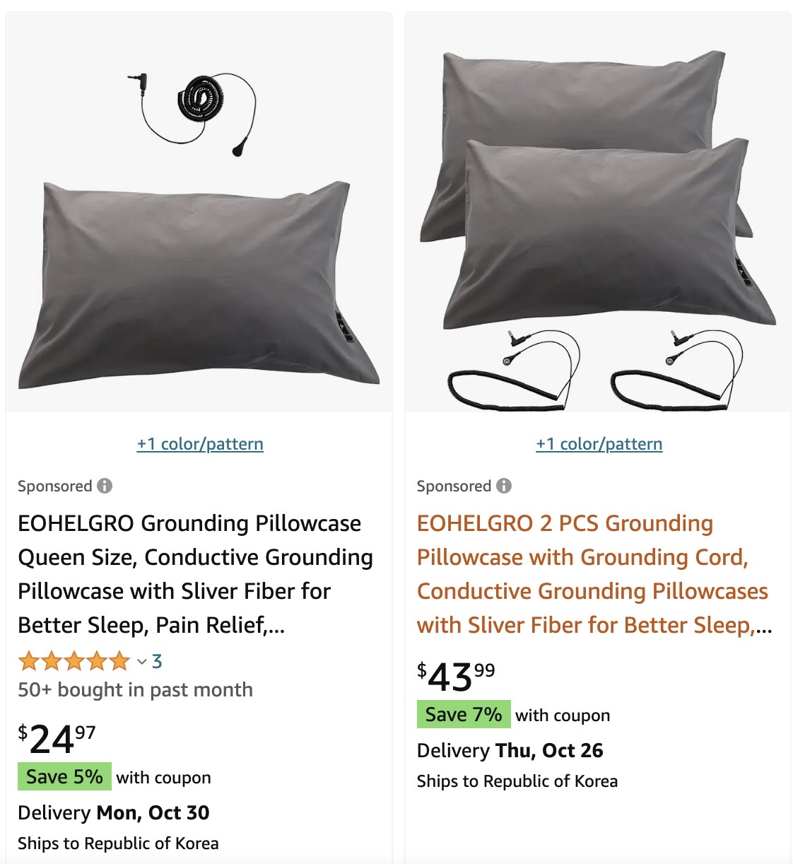 해외 온라인 상품들을 살펴보겠습니다. 가격대도 다양하고, 베개커버의 경우 25불 짜리도 있습니다. 미국제품은 의외로 배송이 빠릅니다. 배송비는 비슷합니다. 링크 조회가 잘 안 되면 온라인쇼핑몰 사이트 접속하여 "sleeping earthing products" 로 조회하시면 됩니다.