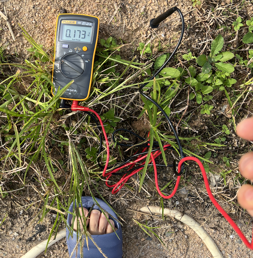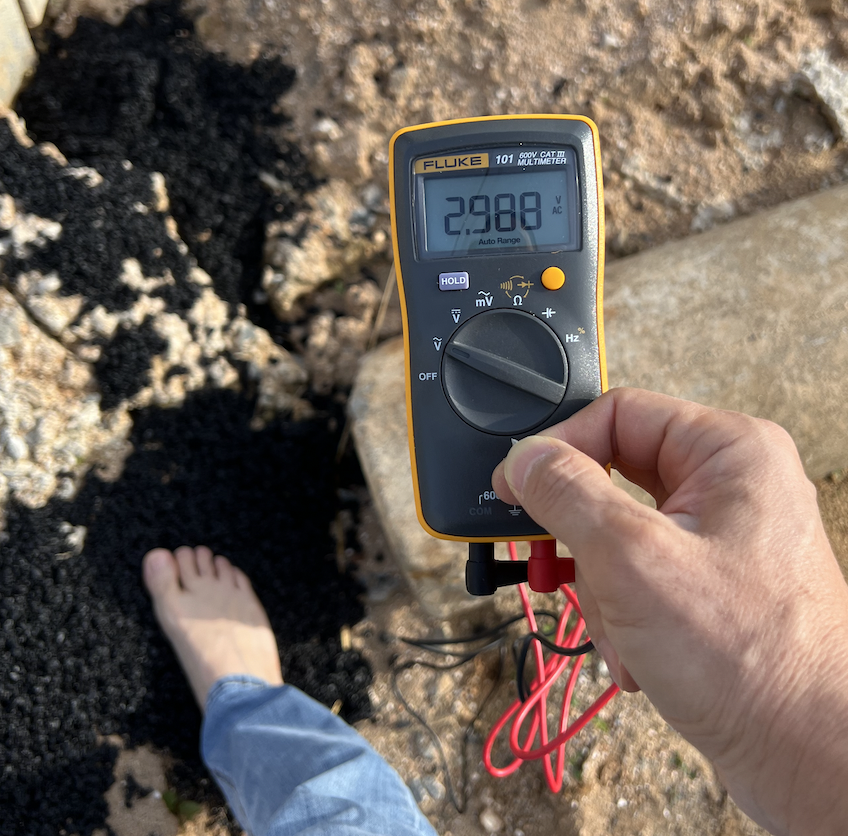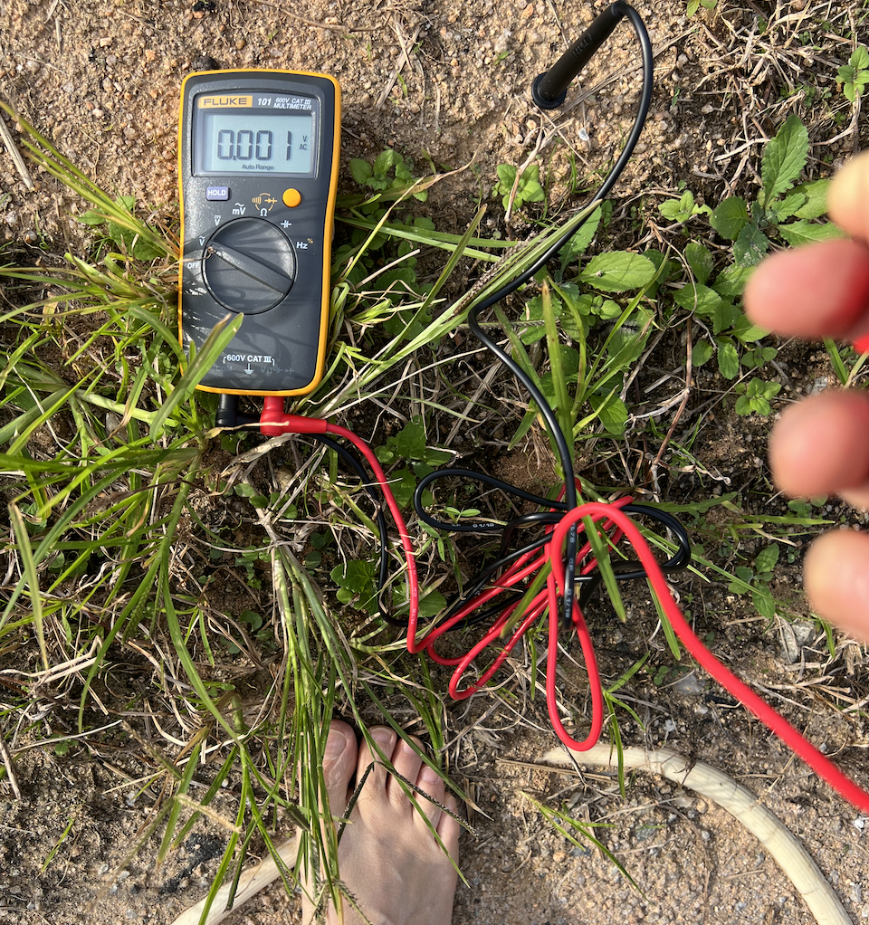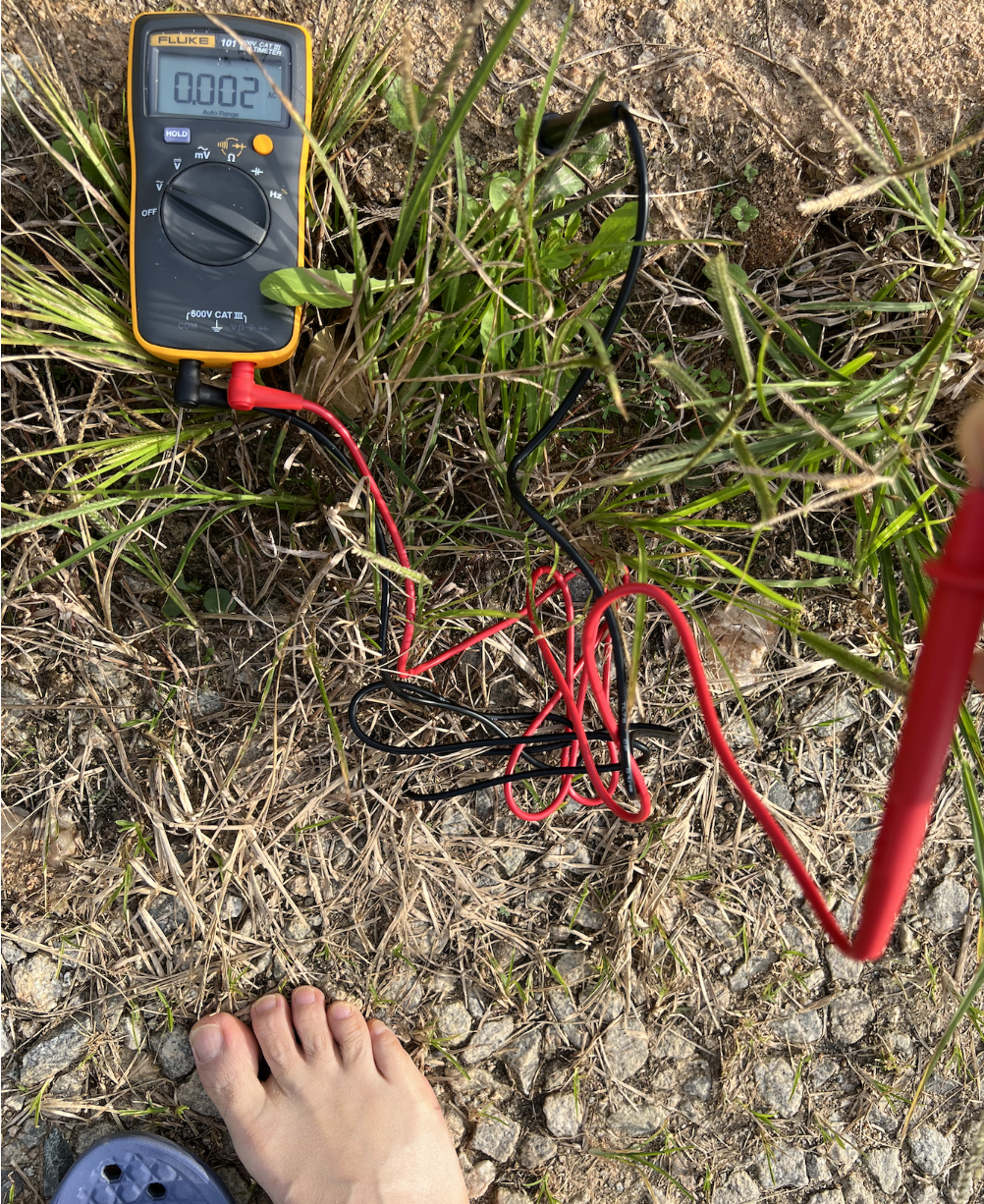 1). 맨땅에서 인체전압 측정 전압계 세팅은 동일하게 하고, 신발을 신을 채로 프로브 한 개는 땅에 찔러 넣고 다른 하나는 맨 손으로 잡아서 전압을 확인합니다. 0.173 볼트가 나왔습니다(좌측사진). 아래사진 우측과 같이 신발을 벗고 맨발을 디딘 채로 확인합니다. 전압이 0.001 볼트로 떨어짐을 확인할 수 있습니다.