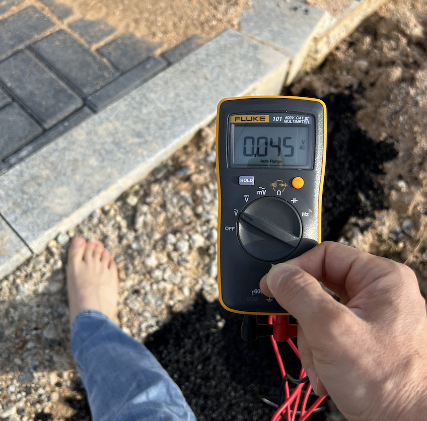 4). 콘크리트에서 인체전압 측정 프로브 한 개는 콘크리트 주변에 있는 맨 땅에 꽂아 넣습니다. 맨발로 콘크리트를 디딘 상태에서 인체전압을 측정합니다. 0.045 볼트로 맨땅에서 보다는 조금 더 나옵니다. 맨땅보다는 접지 연결이 좀 덜 되는 것을 알 수 있습니다. (전신주와 가까운 데서 측정한 값이라, 전신주를 피할 경우 좀 더 낮은 값이 나올 수도 있습니다.)