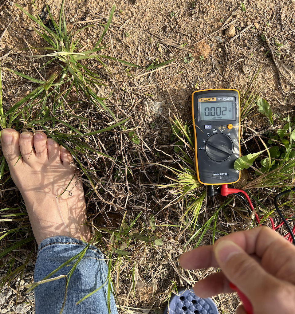 2). 풀밭에서 인체전압 측정 풀밭에서 맨발 접지를 한 상태에서 프로브 한 개는 땅에 찔러 넣고 다른 하나를 맨 손으로 잡아서 전압을 측정합니다. 0.002 볼트로 맨땅에서 측정한 결과와 유사합니다.