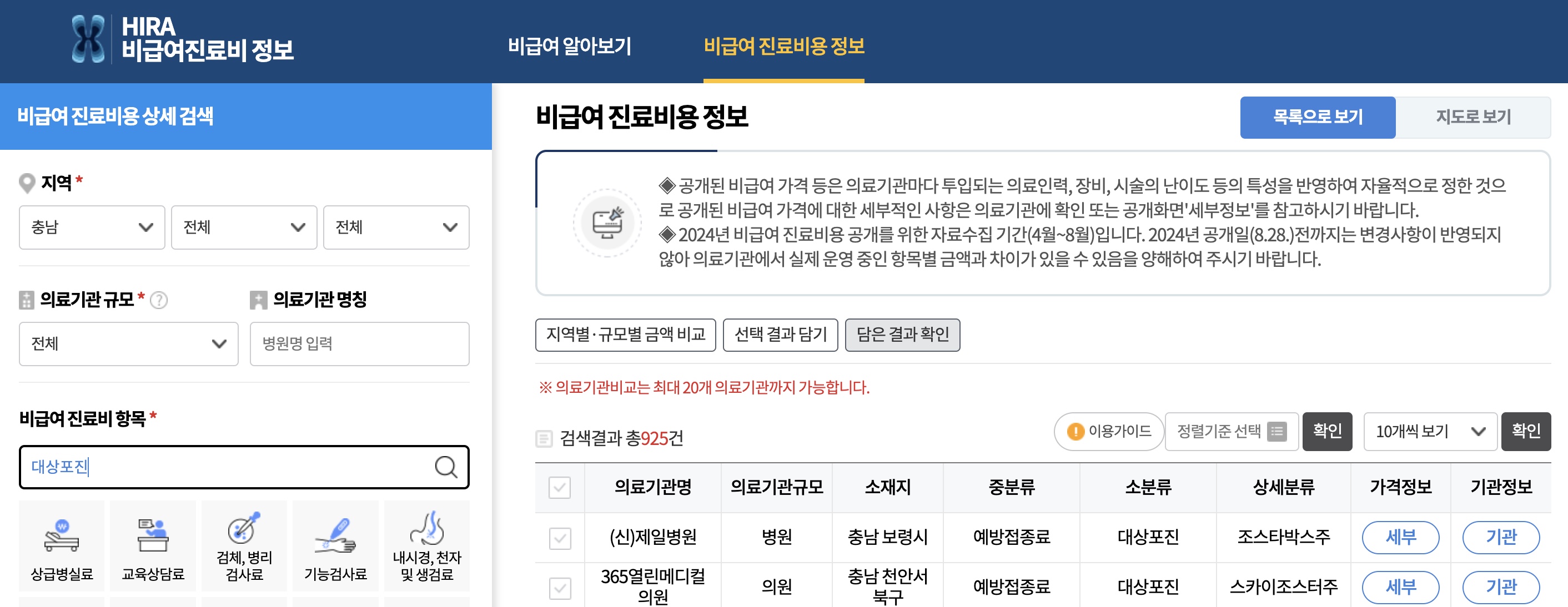 좌측 상단에 거주하는 지역을 '충청남도'로 선택하고 비급여진료비항목 란에 "대상포진"을 기입 후 검색, 예방접종료를 '대상포진'으로 선택, 상세검색한 다음 우측의 병의원 정보에서 가격정보 '세부' 버튼을 눌러 조회하면 됩니다.